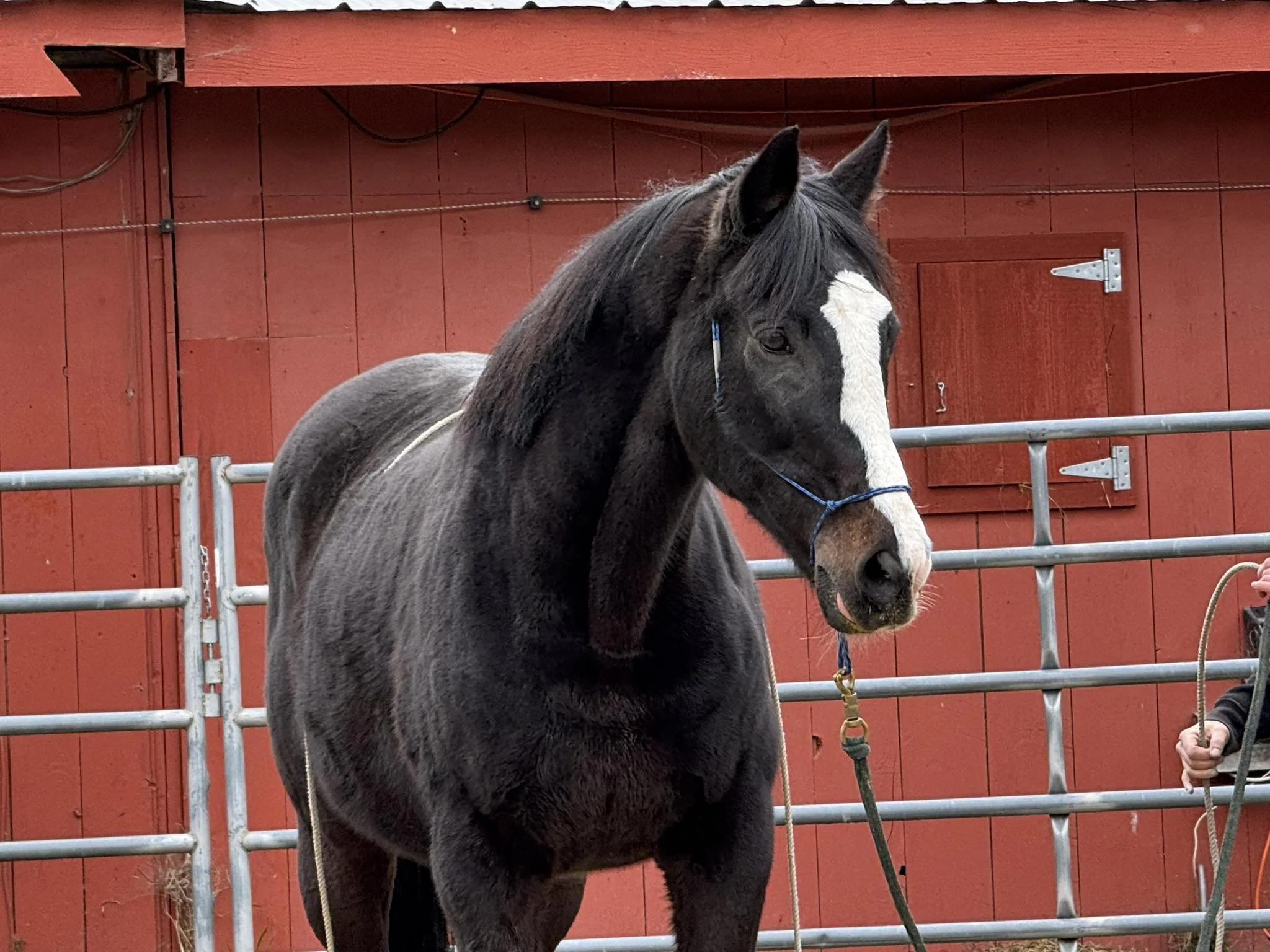 This stunning jet black Standardbred 19-year-old mare (6CD46) “Celebrity Godiva” arrived from a PA kill pen with overgrown hooves and three road shoes still on. And sadly, a full milk bag. She had been an Amish buggy horse. We did not realize she was going blind at first, but she did go completely blind while with us. Her stablemate here is Reven; she relies on him when they are turned out. We understand it’s not easy to place a blind horse in a SAFE home,. asking for her to go to a home with Reven is a huge ask…